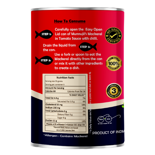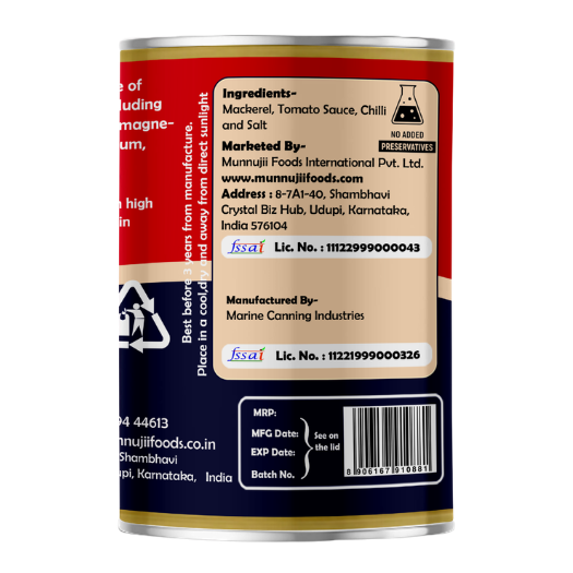 Munnujii canned Mackerel in tomato sauce and chili. Packed with premium-quality Mackerel, the rich tomato sauce adds a tangy zest, while the chili spice adds a delightful kick. Indulge in this delectable fusion, perfect for adding a burst of flavour to your meals.
